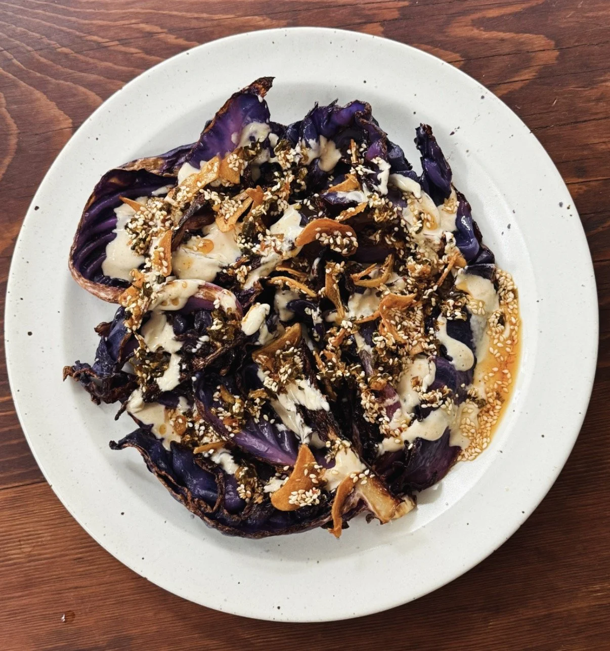 Plate. Arrange the roasted cabbage wedges on a plate. Drizzle with the tahini sauce and scallion oil. Sprinkle with flakey salt.